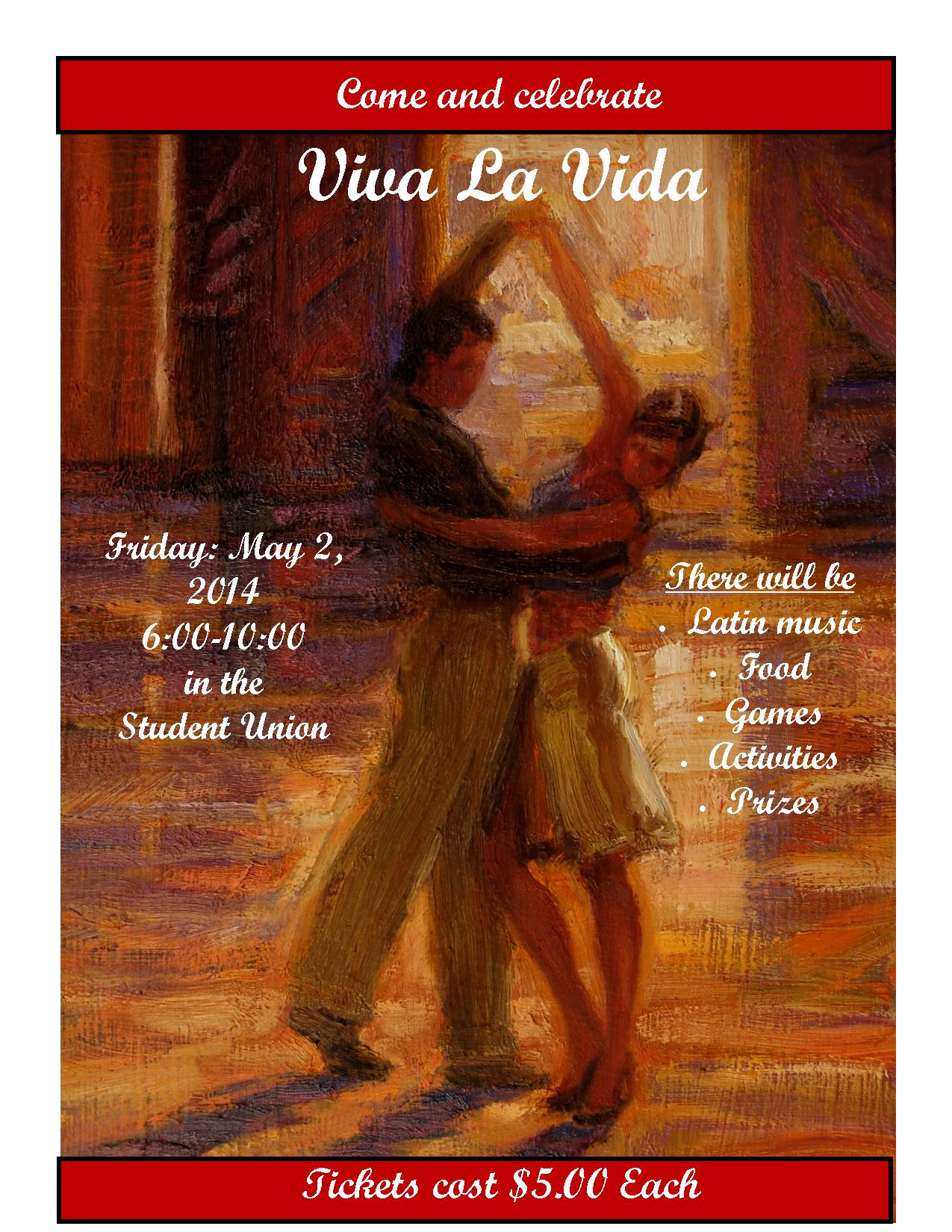 Viva La Vida will be this Friday May 2 from 6:00-10:00 in the Student Union.