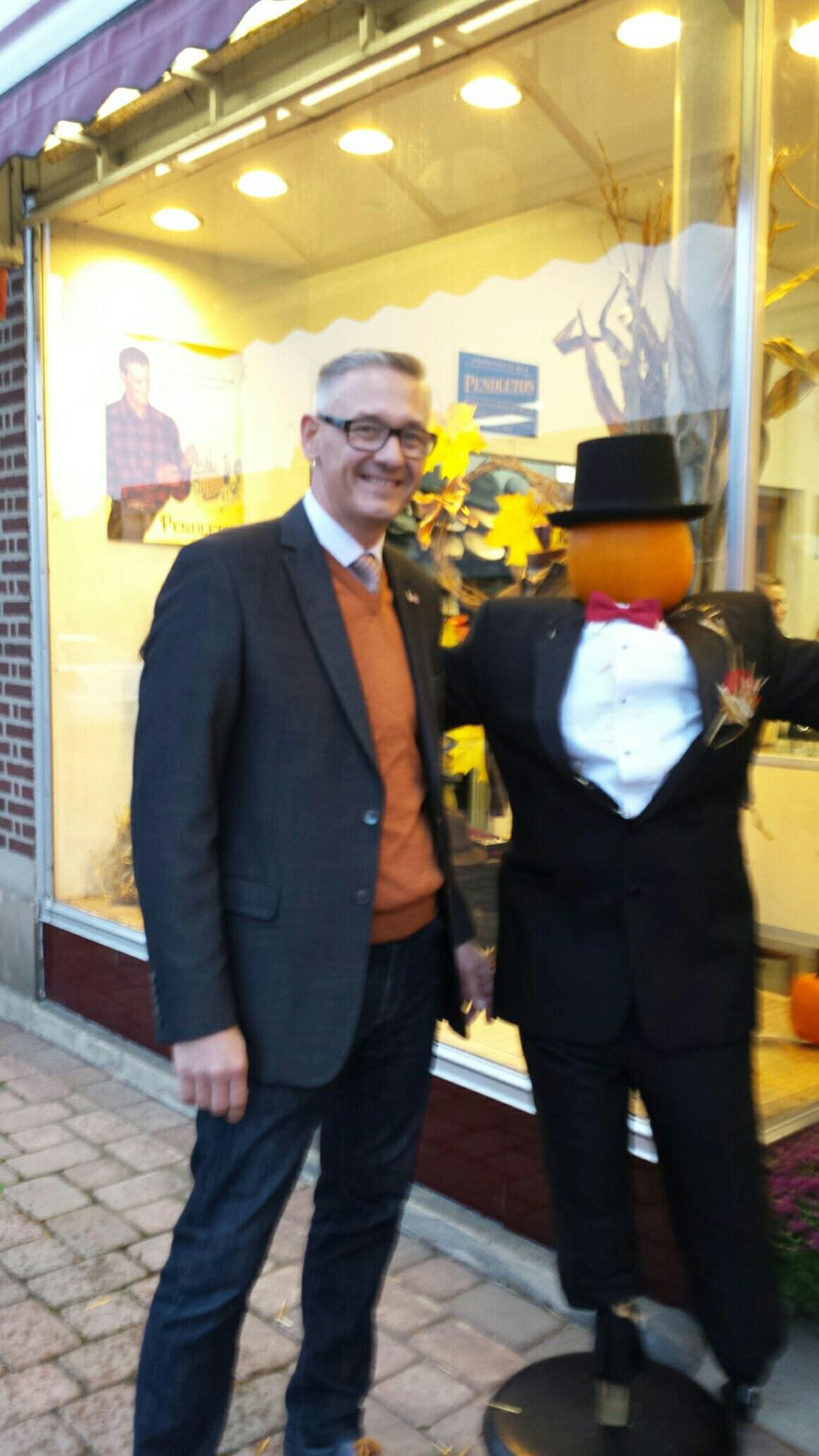 Don Brown, the VP of the store posing with the most popular man of the night. This scarecrow was Selfie Central.