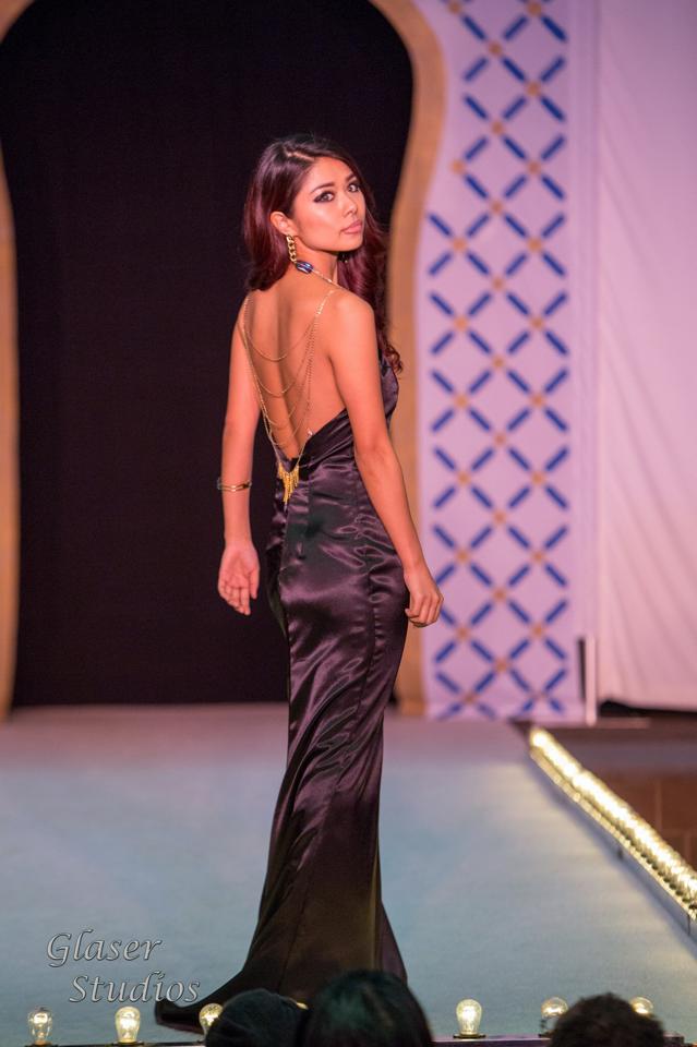 Fashion Merchandising student Kana Tatsumi modeling jewelry she made herself, and a gown by Fashion Design Student Abby Wilcox.