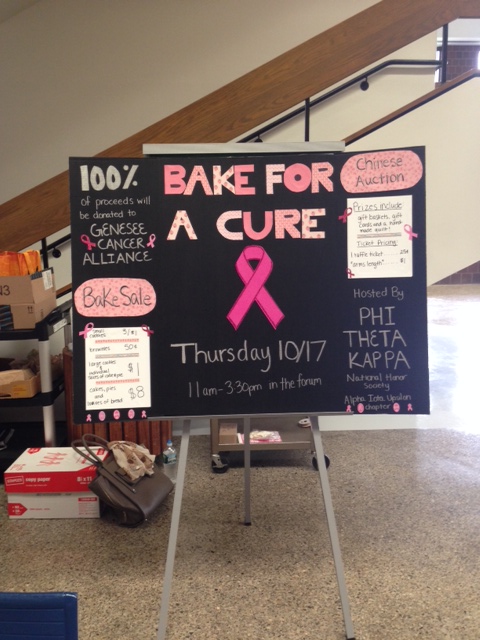 Genesee Community College’s chapter of Phi Theta Kappa National Honor Society hosted their third annual “Bake for a Cure” event this afternoon, Thursday October 17th on campus. With the help of our members, the adviser and officer team set up a booth in the forum and sold tasty treats throughout the afternoon. Attracting hungry students and teachers alike, our annual bake sale was a huge success and we were able to raise well over $300! One hundred percent of the proceeds will be donated directly to Genesee Cancer Assistance, a local organization that provides aid for those affected by cancer and their loved ones.