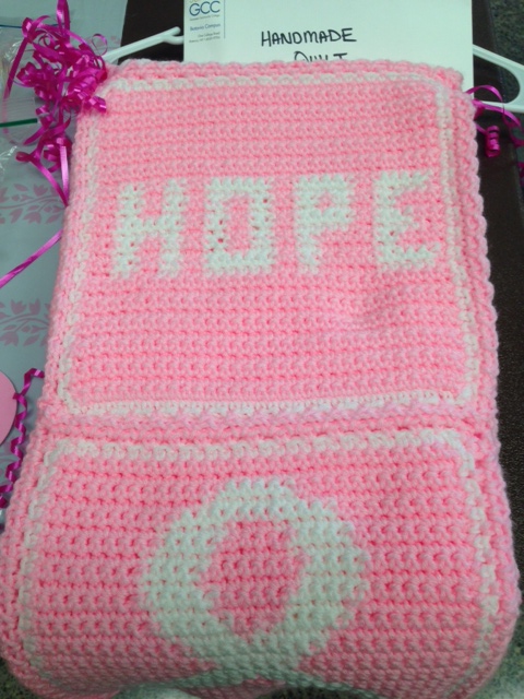 In addition to our baked goods, we also sold raffle tickets for donated baskets and items. Our donated raffle items included gift cards, gift baskets, jewelry, and a beautiful pink ribbon quilt handmade by lung cancer survivor Deb Levinstein.