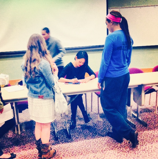 Anya Ayoung Chee signs autographs for fashion students following her presentation at Genesee Community College on Wednesday.