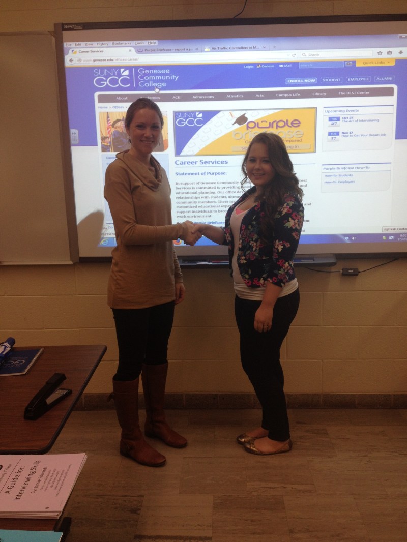 On the GCC website in the section for Career Services, it says this, “In support of Genesee Community College’s mission and vision, Career Services is committed to providing assistance in navigating career and educational planning. Our office develops and sustains positive relationships with students, alumni, faculty, staff, employers, and our community members. These meaningful partnerships, in addition to customized educational experiences, are designed to coach, prepare, and support individuals to become a career confident citizen in the global work environment.” The key phrase from that statement was, “Our office develops and sustains positive relationships with students and faculty,” and their office was doing just that by Jamie Edwards, a Career Services Specialist, coming into Mr. Dudkowski’s Professional Sales class this past Friday to talk with our class.
