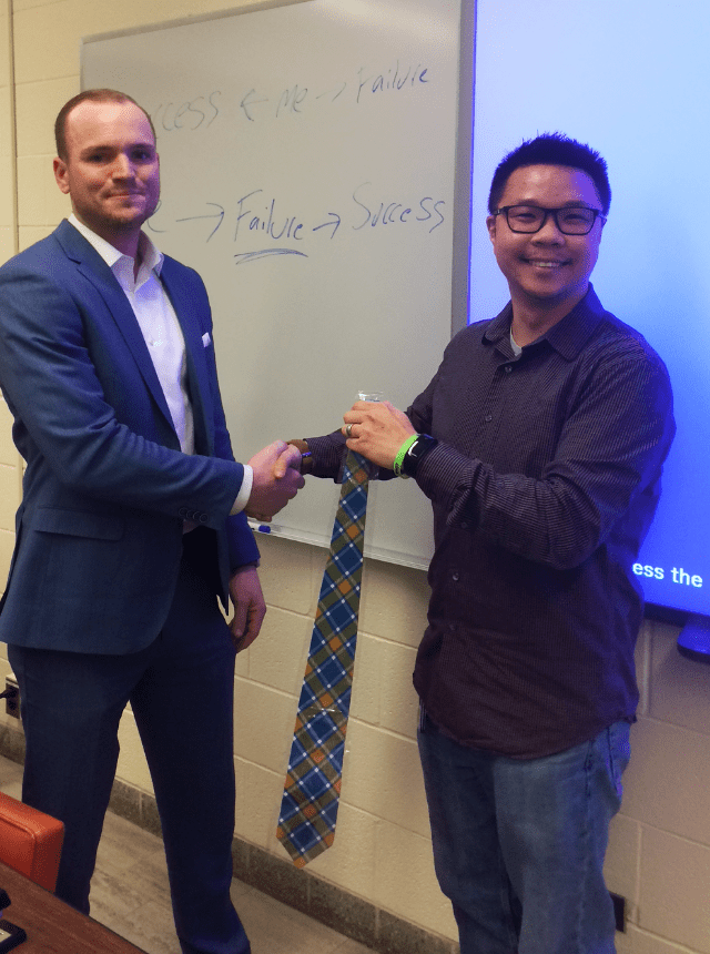 Chappius gave his final advice to the students in the class, which was “be a person, be yourself, know your products, never use “Me” and “I”, and always listen to your clients. After this presentation, students were given the opportunity to ask Chappius questions. At the end of the class, Chappius was given a GCC Plaid Tie as an appreciation for coming to GCC and sharing his experiences with the students.